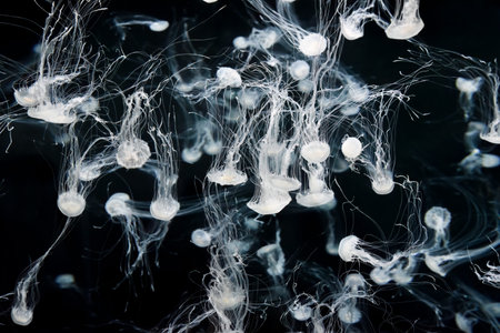 In a dimly lit tank, Japanese sea nettles Chrysaora pacifica glide with fluid motion amid ambient light, their delicate tentacles forming a mesmerizing display against a mysterious background