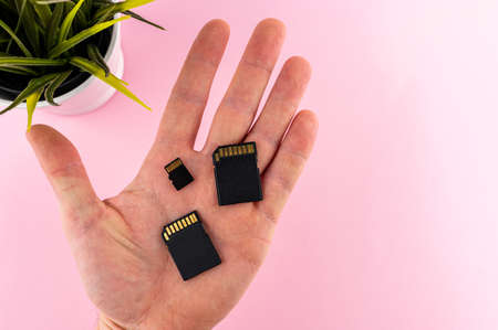 SD memory card hand removable on white Backgrounds - Close up SD memory card in fingers