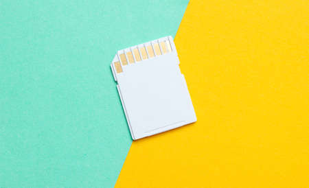 sd and micro sd memory card on blue and yellow background. different kind of portable storage devices. data store concept