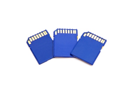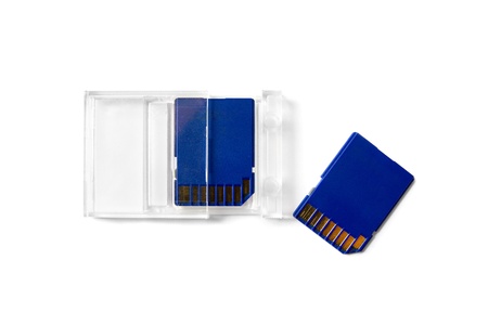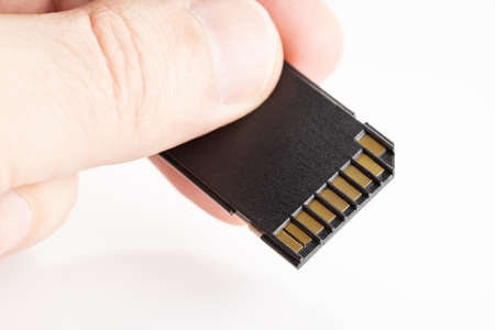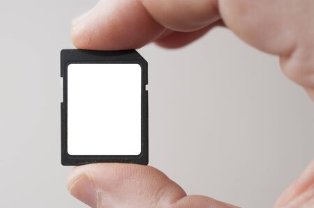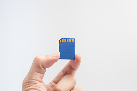 Hand holding a SD memory card on white background. Photographic equipment. Copy space