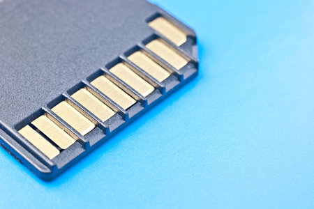 Blue compact memory card for camera in closeup. Blue Secure Digital Memory Card Back side of digital media with contact tracks Isolated blue background Full size Secure Digital High Capacity card for digital cameras.