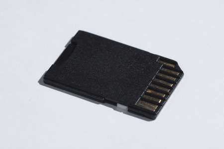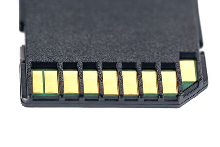 Detail of a small storage memory, visible electrical contacts, on a white background