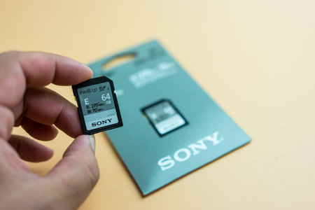 Bangkok, Thailand - March 27, 2023 : Close up of Sony SDXC UHS-II SD memory card for writing data. Sony memory card.