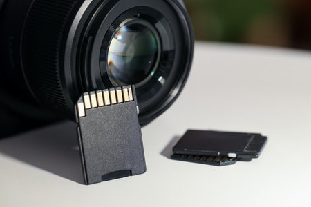 flash card in hand on camera background, memory card for SLR camera, flash drive, photo storage