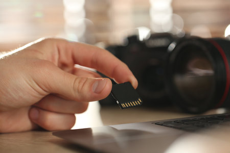 Man inserting SD memory card into laptop at wooden table indoors, closeup