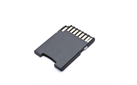 Detail of a small storage memory, visible electrical contacts, on a white background