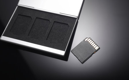 SD memory on yellow paper background. Minimalistic technology concept, modern storage media.