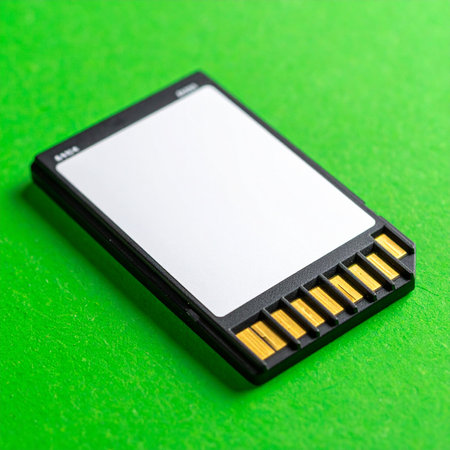 A close-up of a modern SD memory card on a vibrant green background. With its blank white label, it symbolizes a fresh start for a new project, whether for photography, video, or critical data backup.