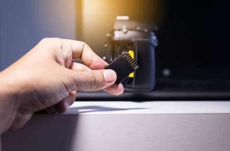 Photographer's hand holding memory card for preparing his camera before photography.