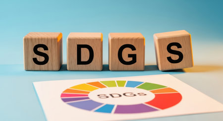 Wooden cubes spelling SDGS are arranged next to a colorful pie chart illustrating the Sustainable Development Goals on a vibrant blue surface. This visual represents global efforts for a sustainable future.