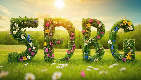 Big word made of flowers on green meadow in sunny day.