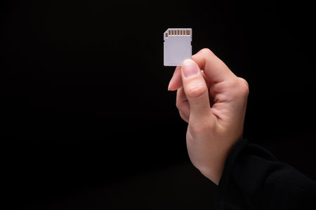 Female hand of caucasian woman holding sd flash card on black background