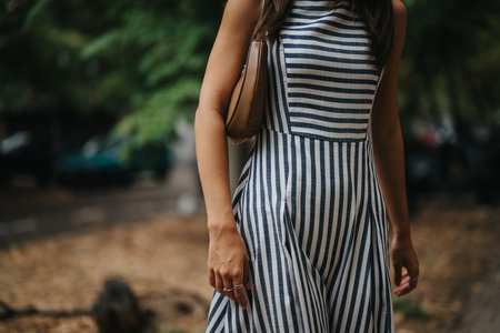 Woman in striped dress walking through a serene park setting
