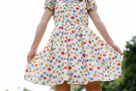 Beautiful brunette woman demonstrating spring clothes.