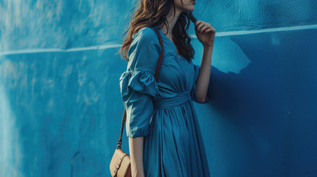 Woman in blue dress by blue wall