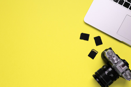 photography concept - top view of camera, equipment and computer