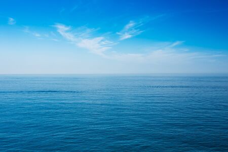 A blue calm sea connects to the horizon of a blue sky. Beautiful natural background, seascape, summer, travel, vacation. Image