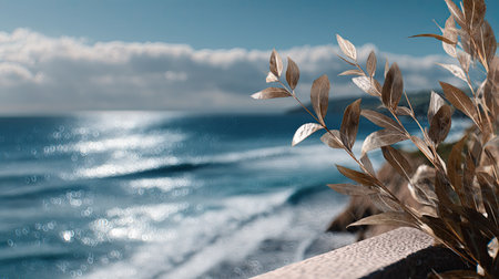 A serene ocean view featuring delicate leaves in the foreground catches the sunlight, offering a calming atmosphere with soft waves and a clear horizon.