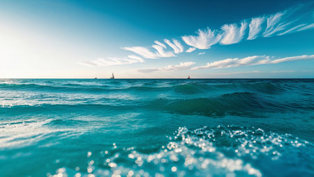 Sailboats are sailing on tranquil turquoise water with beautiful cirrus clouds in the sky. Ai generated image