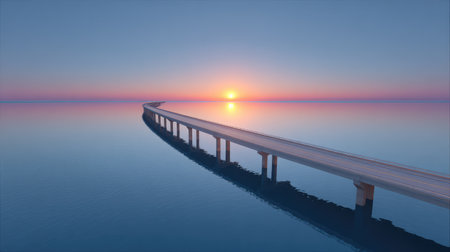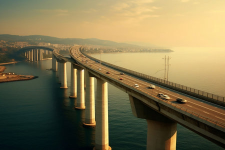 A suspension bridge crosses the ocean from a bird's eye view, and trucks are passing by in the evening. 3d rendering and illustration