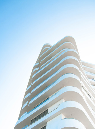 A striking image of modern architecture featuring clean lines and balconies against a bright blue sky, highlighting contemporary design and structural beauty.