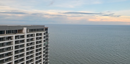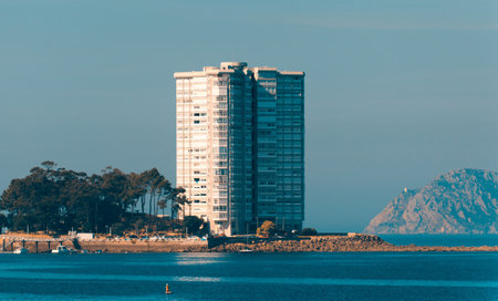 A modern high building with balconies against a sunset sky and beautiful sea with the orange light of sunset, space for copy and design, landscape image.