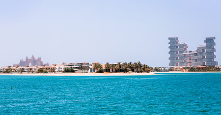 Dubai, UAE - August 30, 2022:New Atlantis at Palm Jumeirah and villas with white sand beaches