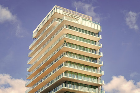 Part of the facade of a white high-rise building with asymmetric balconies. Vertical frame