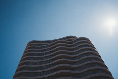 Low angle view of a contemporary office building with a unique curved facade reflecting the blue sky