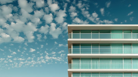 A modern building with glass balconies stands against a bright blue sky with white, puffy clouds.