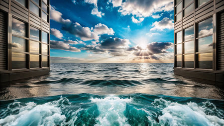 Open windows reveal a stunning ocean sunset with dramatic waves crashing below.