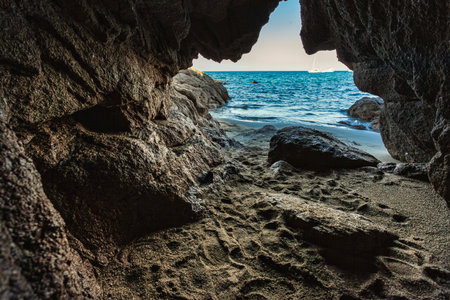 Sailboat navigating on the turquoise waters of cala sa figu, seen from inside a cave on a sunny summer day