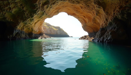A breathtaking view of a natural sea cave carved into the dramatic cliffs of the Algarve coast. The golden hour sun casts a warm glow on the rugged rock formations. Algarve, Portugal.