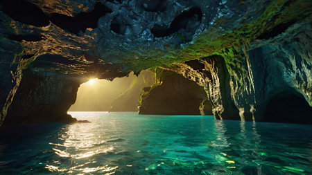 Cave with crystal clear turquoise water and reflections of light
