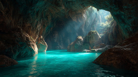 Cave with turquoise water and rays of light. 3d rendering