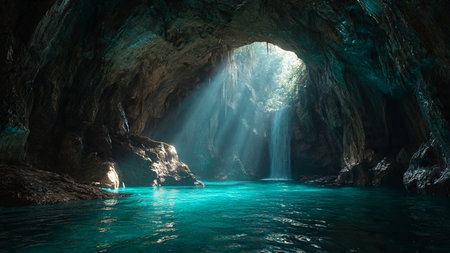Beautiful view of a beautiful waterfall in a turquoise cave