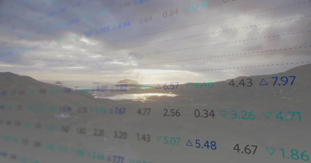 Showing financial data overlay spanning coastal bay and rolling hills under dense cloud cover. Coastal, landscape, metrics, analytics, technology, outdoor, atmospheric