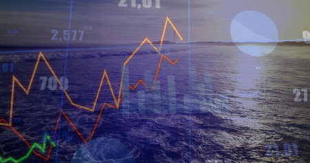 Presenting chart overlaying coastal seascape, with green yellow white bars and red blue line plots. Seascape, data visualization, analytics, marine, infographic, technological, environment