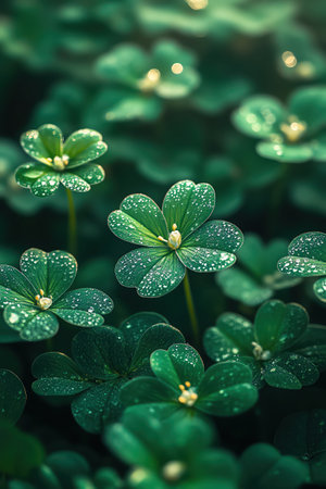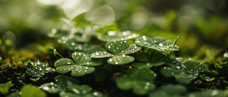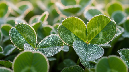 Macro view of vibrant green clover leaves covered in sparkling dew drops, illuminated by soft morning sunlight.
