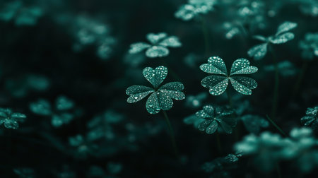 A close-up of green shamrocks against a dark background, symbolizing St. Patrick's Day and the tradition of good luck in America. --chaos 30 --ar 16:9 --v 6.1 Job ID: 99a15a6d-ba5b-48ef-8dda-3058b1cc6079