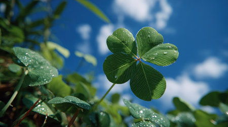 A four-leaf clover, the central subject, is captured in close-up against a backdrop of a vivid blue sky dotted with white clouds. The clover's green leaves display water droplets, showcasing texture. The image employs shallow depth of field, emphasizing the foreground. Suitable for various editorial and commercial applications.