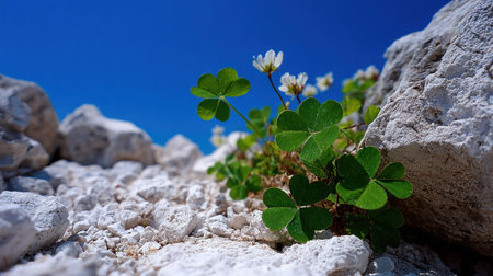 A close-up shot showcases a clover plant with bright green leaves and delicate white flowers. The plant thrives among light-colored rocks, contrasting with a clear, vibrant blue sky. This image, with its shallow depth of field, evokes a sense of natural beauty and could be used for various commercial projects.