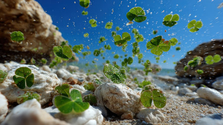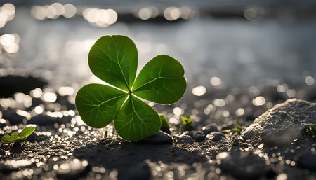 A close up shot of a four leaf clover growing on a rocky shore. The clover is green and vibrant, and the background is blurred, creating a sense of depth and focus on the clover.