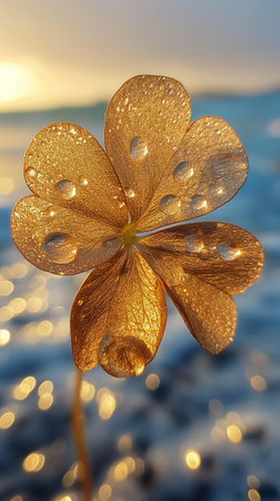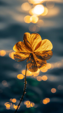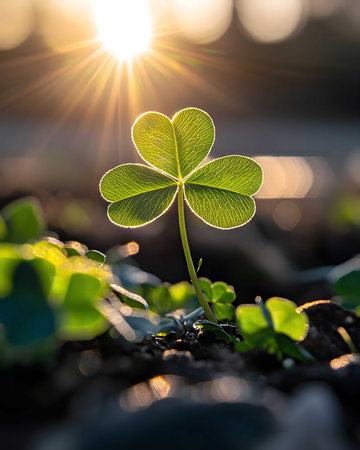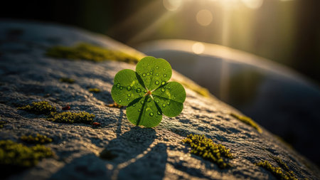 A detailed image showcases a four-leaf clover, the primary subject, resting on a textured surface. The scene is illuminated by sunlight creating a warm glow. The composition highlights details of the leaves, offering a sense of depth. This image can be used for various purposes, including editorial and marketing materials.