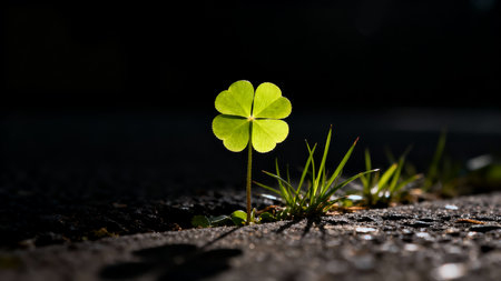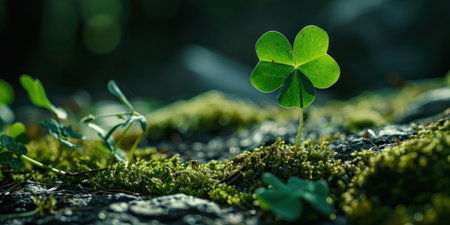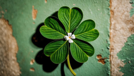 Vivid photo of a four-leaf clover on a background of textured greenery, symbolizing good luck and Irish heritage, close-up.