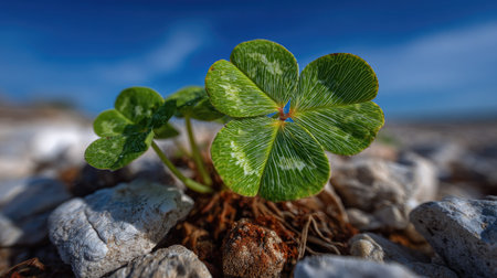 A close-up captures a four-leaf clover, showcasing vibrant green hues and intricate leaf textures. The composition features the clover amidst small rocks, with a soft-focus blue sky in the background. This image could be used for various purposes including illustrating concepts of luck, nature, and good fortune.