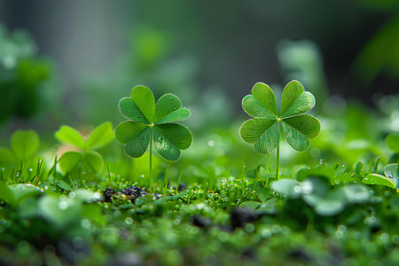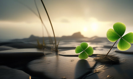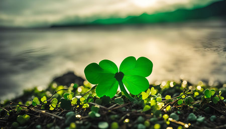 Captivating stock illustration of a four-leaf clover in Ireland, with a dreamy blurred backdrop. Generative AI.