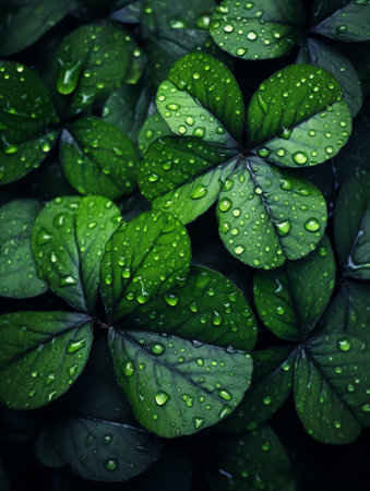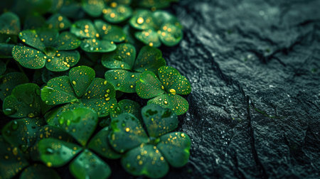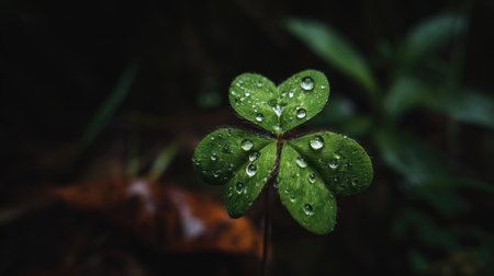 Lush green four-leaf clover with droplets of water is set against a dark background, highlighting its vibrant color and intricate texture for nature-themed use