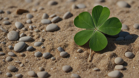 AI Generated. A clover leaf arranged on a beach pebble with beach sand in the background
