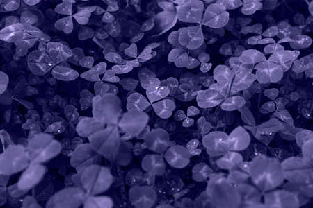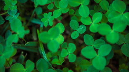 Close-up of real leaf clover on green shamrock field background. Clovers grass texture. Abstract natural leaves in the forest with copy space, top view.